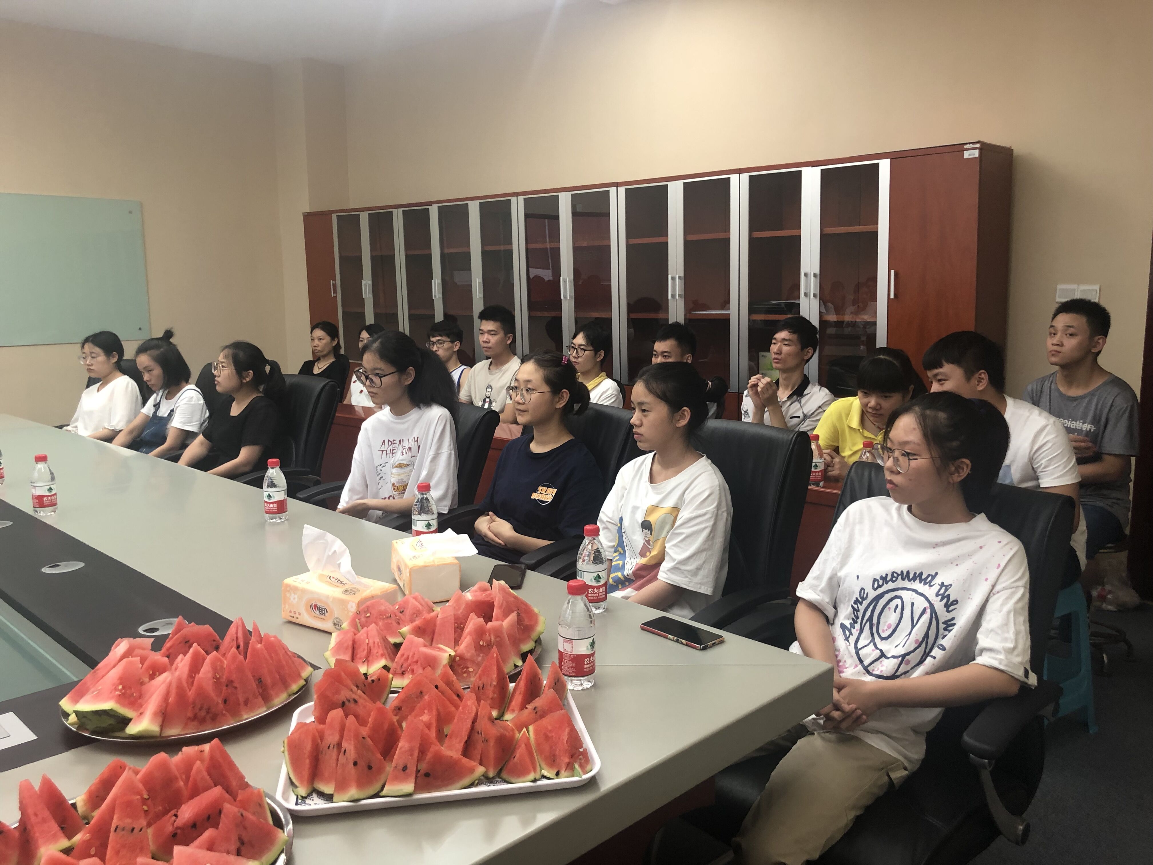 最后,同学们积极发言,提出自己在考研复习中遇到的问题,老师们都一一进行了解惑。座谈会在热烈的交流中圆满完成。座谈会上,公司还为留校员工准备了消暑降温慰问品。