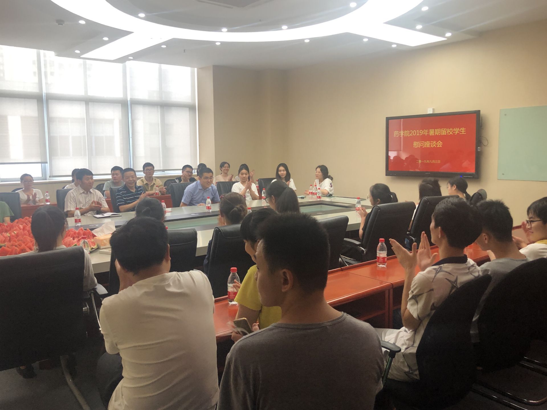 8月3日下午,太阳成集团tyc151cc在格物楼七楼会议室举行2019年暑假留校员工慰问座谈会。公司经理陈中祝、党总支书记/副经理李忠彬、教学办孟江平、2016级辅导员王俊以及40余名留校备战考研和实训的同学参加座谈会。